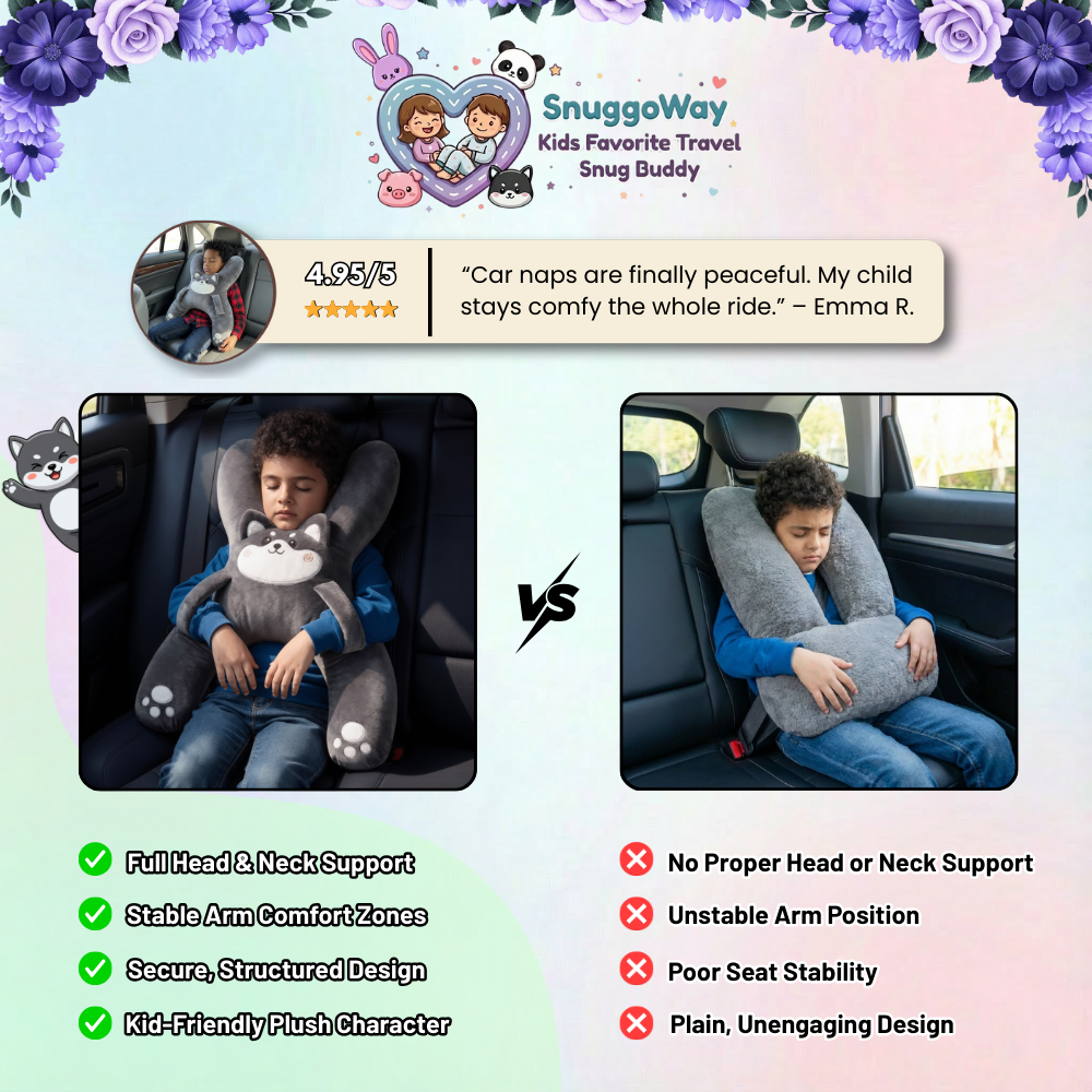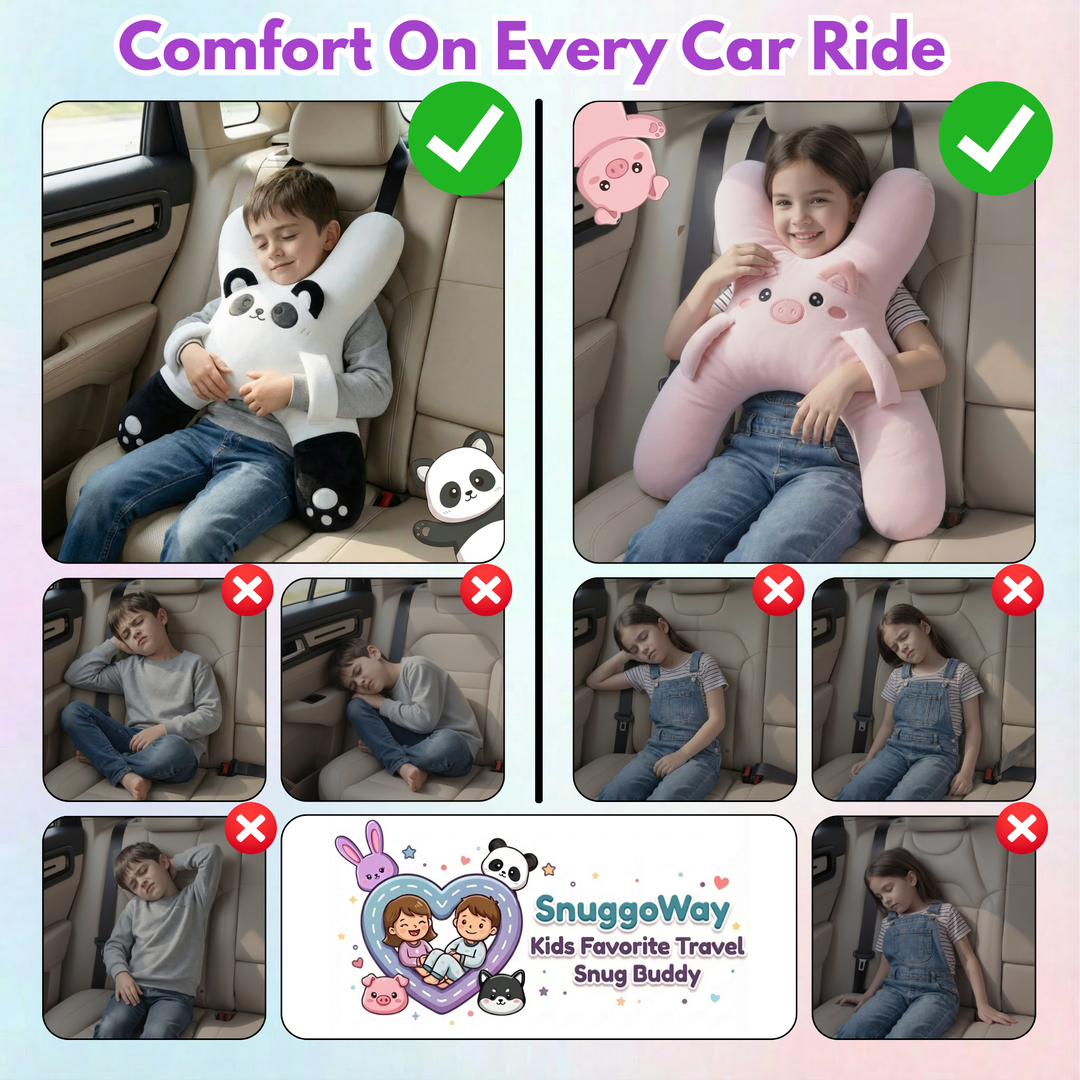 Unlike common travel pillows that slip, collapse, or leave kids unsupported, SnuggoWay stays in place and supports the whole upper body. Its secure, hug-friendly design helps kids settle faster, fidget less, and rest comfortably—ride after ride.